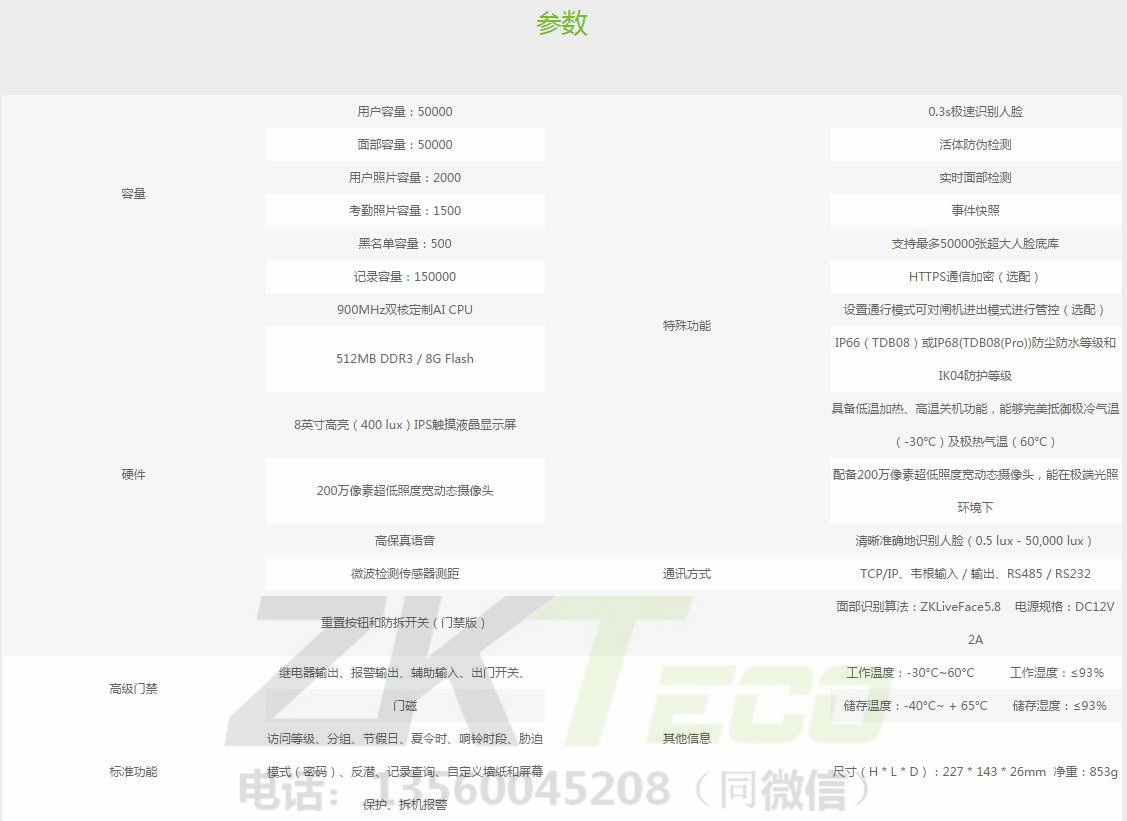 TDB08是中控智慧可見光產(chǎn)品系列的全面升級(jí)版本,適用各種場(chǎng)景。TDB08搭配最新定制的AI CPU,用于運(yùn)行面部識(shí)別算法,以提高其各方面的性能。配備強(qiáng)大的CPU和最新AI深度自主學(xué)習(xí)面部識(shí)別算法,揭開生物識(shí)別領(lǐng)域新篇章。此版本支持最多50,000張人臉底庫,人臉識(shí)別速度小于0.3秒,采用雙目光電硬件+活體識(shí)別算法,對(duì)打印的高清人臉圖片、照片、人臉圖像視頻以及各種材料面具的攻擊,具有較強(qiáng)的防偽能力。除強(qiáng)大的CPU和人臉?biāo)惴ǎ琓DB08還配備了最新的超低照度寬動(dòng)態(tài)攝像頭,使終端能夠在極暗環(huán)境下(0.5 lux)進(jìn)行人臉識(shí)別,同時(shí)應(yīng)用微波探測(cè)器,精確計(jì)算用戶與設(shè)備之間的距離,從而喚醒識(shí)別終端。設(shè)計(jì)堅(jiān)固耐用,可在極端天氣下正常運(yùn)作,能夠完美抵御極冷氣溫(-30°C)及極熱氣溫(60°C);可達(dá)到IP66(TDB08)或IP68(TDB08(Pro))防塵防水標(biāo)準(zhǔn)及IK04防護(hù)等級(jí)標(biāo)準(zhǔn),增強(qiáng)其戶外耐用性。