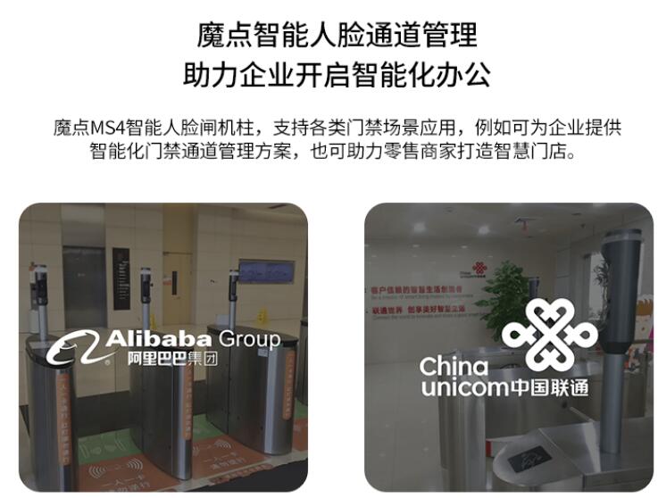 魔點MS4智能人臉閘機柱,支持各類門禁場景應用,例如可為企業提供智能化門禁通道管理方案,也可助力零售商家打造智慧門店。